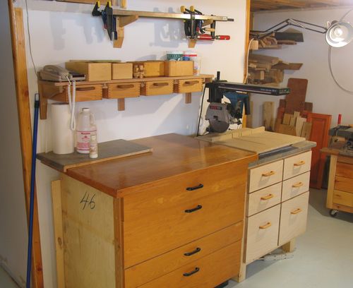 To the right of this is a dresser that I built to use as a radial arm saw stand. The drawers are all recycled 1970's desk drawers that I refaced. Above it is a Shelf with drawers, which holds miscellaneous machine screws and unsorted wood screws.