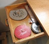 The side of the workbench nearest the table saw has a shallow drawer on the left end of it, pulling out towards the band saw. That drawer is dedicated to circular saw blades. It's a recycled wooden desk drawer, with some pieces of 5/8" dowel attached to the bottom of it, to keep the sawblades in place.
