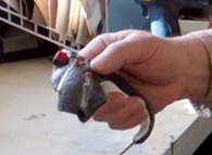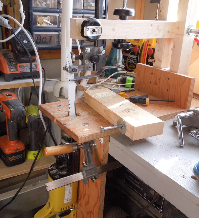 Bill made this jig for experimenting with making something similar to bandsaw boxes, but without that extra cut that is always needed to get in and out with a bandsaw. The reciprocating saw can't follow curves like a bandsaw can, but Bill just uses a large drill to pre-drill the inside corners, so the reciprocating saw only needs to make straight cuts.