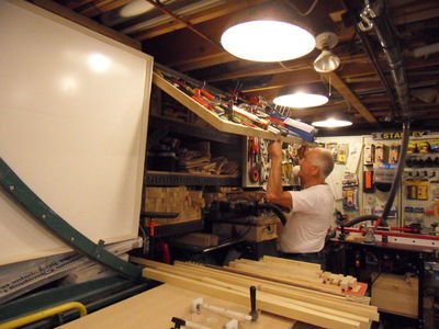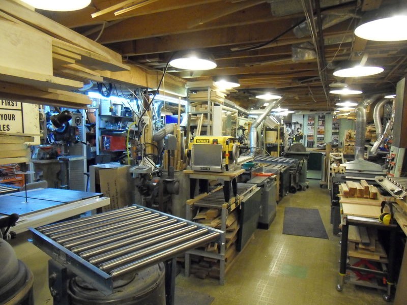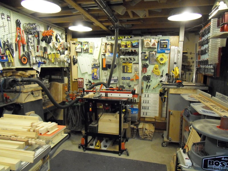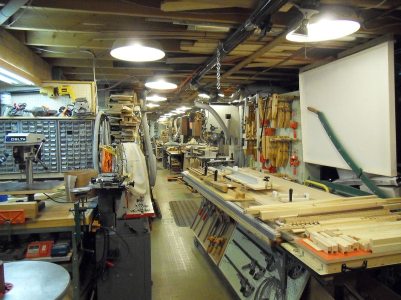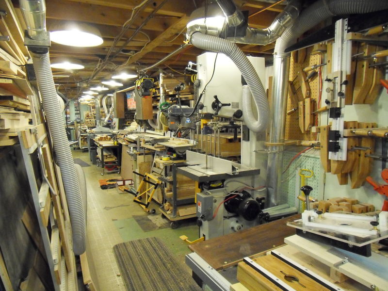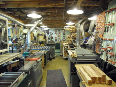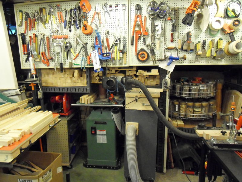 This is a view of the fourth corner. Behind the wall of pegboards are shelves for veneer. The router table is a Jessem. On the right are three Delta oscillating disc and drum sanders. Tools on the left wall are more visible on the next photo.