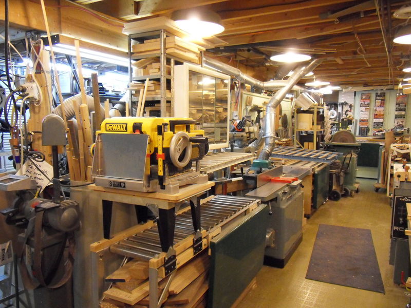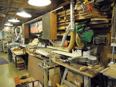 On the right is a white board for lectures. The green arm is a 44" guillotine (hidden ) to cut veneer. Behind the screen is a large compressor which distributes air all over the shop. The table is a horizontal panel saw system. The saw (not shown) rides on a track and I use it to rip plywood sheets.
