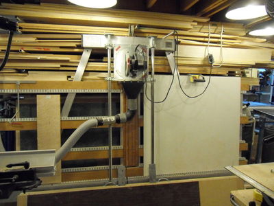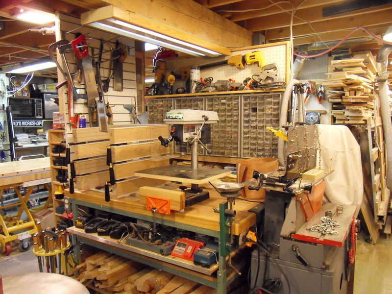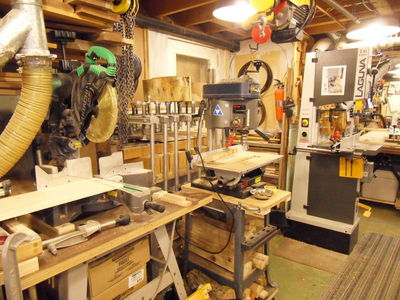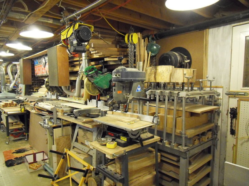 In the background (behind the drill press ) is a shop made veneer press which is used with the electric winch hanging from the ceiling. The winch lifts the upper platen. It makes it easier to insert the veneer material without having to remove the cauls or the upper platen.
