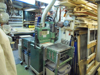 This is a better view of the 20" Delta planer. It has roller stands on each side which can be raised or lowered to match the height of the table. This is done with automotive scissor jacks.