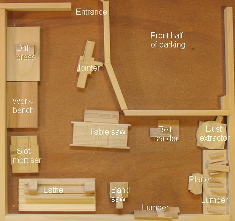 I tried to figure out a good layout for where to put my old table saw, jointer, and slot mortiser in the back of my shop (left on the photo at left). As it turned out, even with a nice layout model, I still couldn't figure out a good placement for these tools that didn't result in some sort of interference here and there.